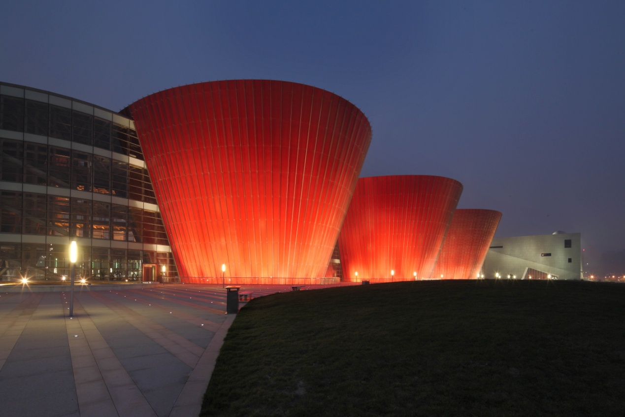 太原博物馆的建筑灵感来源于中国红灯笼,主要建筑为五个相对独立又相互连通的椭圆倒锥体块连接组合而成,锥体向上拔地而起,并舒展开来。两组锥体色彩不同,分别由中国红和青铜色组成,锥体表面由彩色金属板构成,垂直于表面的是烟熏色的从下而上、由深变浅的玻璃页片,其灵感来源于中国北方城市的热情、勇敢、开朗、浑厚。