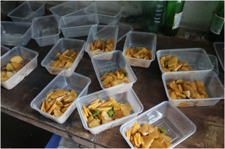 每天免费的套餐盒饭(两荤一素)让工人们吃得非常开心