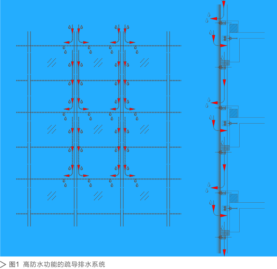 高防水功能的疏导排水系统的原理是允许少量的水进入幕墙骨架系统,利用堵和排的方式,分层分段的进行排水,有组织的将进入的渗漏水排到室外,目的是使幕墙具有更高防水性能,而且一旦出现漏水,能立即查找到漏水点并及时进行处理,最大程度减少损害。