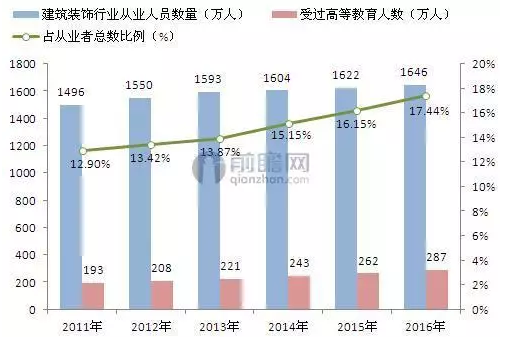 根据统计,建筑装饰行业从业者总量由2005年的1100万人增加到2010年的1500万人,增长幅度达到36.4%左右。2016年全行业从业人员约为1646万人,比2015年增加24万人,增加幅度为1.48%。