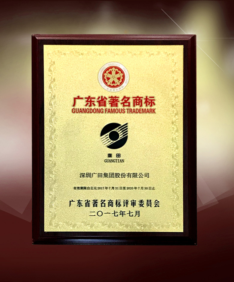 近日,广田集团旗下“广田”商标获得广东省著名商标评审委员会颁发的“广东省著名商标”称号。“广东省著名商标”由广东省工商行政管理局下属广东省著名商标评审委员会认定和管理,其申请条件及审核过程十分严格,是省内商标领域最高荣誉。本次广田斩获此项殊荣,再次验证了广田在品牌知名度、品牌信誉、工程质量、市场评价上的行业地位。该称号既是广田品牌综合实力与影响力的体现,也是市场和政府对广田品牌的认可。同时,“广田”商标作为省著名商标还将获得政府更大力度的知识产权保护,保障品牌利益不受侵犯。