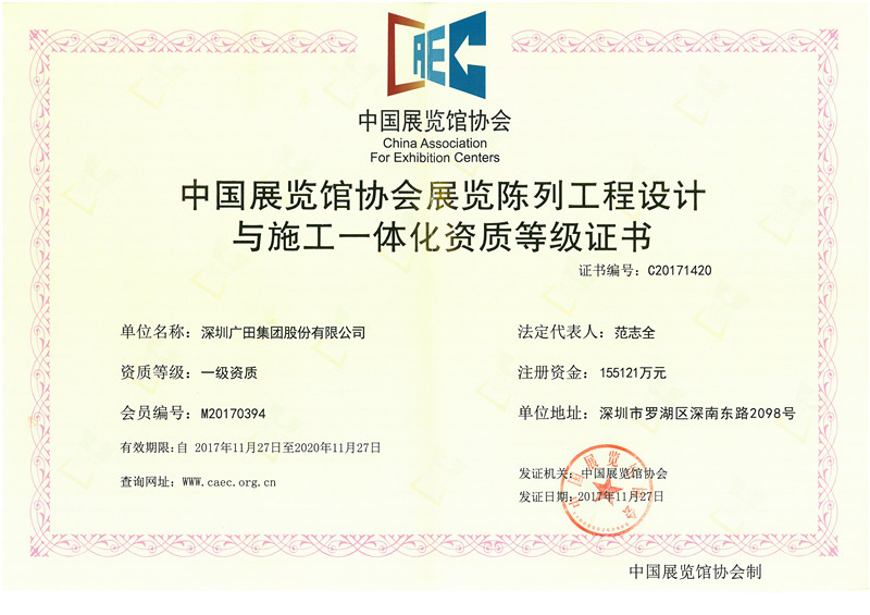 根据《中国展览馆协会展览陈列工程设计与施工一体化资质标准》、《中国展览馆协会展览陈列工程设计与施工一体化资质等级评审与管理办法》的相关规定,中国展览馆协会对广田集团的基本情况、人员条件、技术装备及技术水平等多方面进行了严格审核,最终决定授予广田集团“展览工程一级资质企业”“展览陈列工程设计与施工一体化一级资质”两项一级资质,充分表明中国展协对广田集团的认可与肯定,同时也证明广田集团具备从事展览展示工程设计与施工的技术和服务。