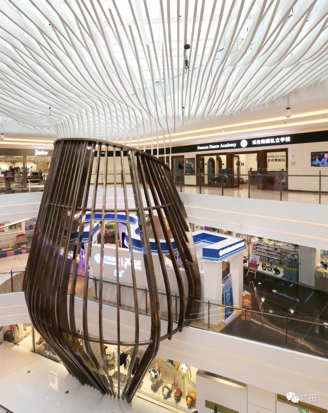 中庭的茶壶挂饰,采用茉莉花茶壶造型,顶部蜿蜒曲折的流线造型,恰如茶壶中飘散的茉莉花香气,蜿蜒向上,带给人静谧的视觉享受。同时,茶盏又如一汪海面,将曲折蜿蜒的万千河流汇聚于此,海纳百川体现的是购物中心独特的气质和胸怀。将自然的元素引入室内,不仅是基于艺术造型的考量,更兼顾到了节能遮阳的作用。