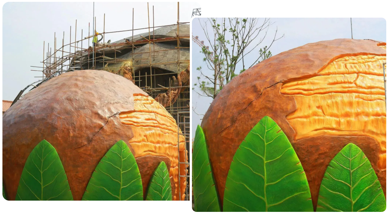 随后将水泥浆涂在钢丝网中,再进行表面“肌肤”处理,这是坚果造型最重要一步。然后再人工刻画仿坚果纹理,选用钢丝制作画笔刻画,在水泥没有凝固之前完成。最后根据坚果屋造型以及坚果类型进行着色,达到最真的效果呈现。