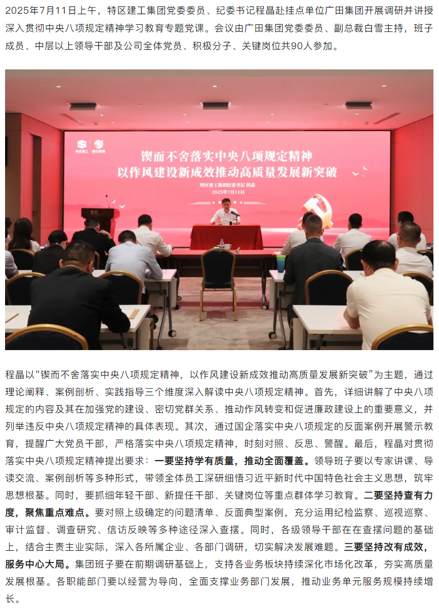 特区建工集团纪委书记程晶带队赴广田集团调研并讲授专题党课
