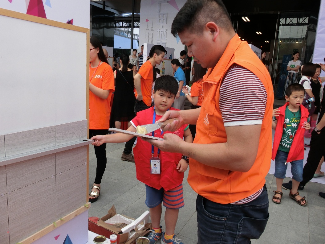 此次活动,中小学生通过直接感知、实际操作和亲身体验,在自由、自主的环境中愉悦的游戏,同期举行的“广田·五星战队挑战赛”之瓷砖、木地板挑战赛,让“小小建筑师们”近距离走进建筑装饰实践体验。现场“小小设计师”纷纷被瓷砖、木地板技能师傅们的专注所吸引,更有小小建筑师与技能师傅们一起参与挑战赛。