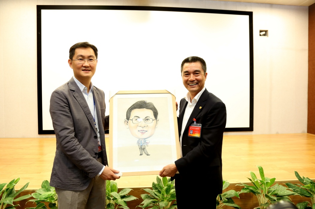 5月20日,叶远西董事长代表清华五道口金融EMBA 2015秋季班的全体师生为腾讯CEO马化腾送上了一幅画有“小马哥”的定制漫画