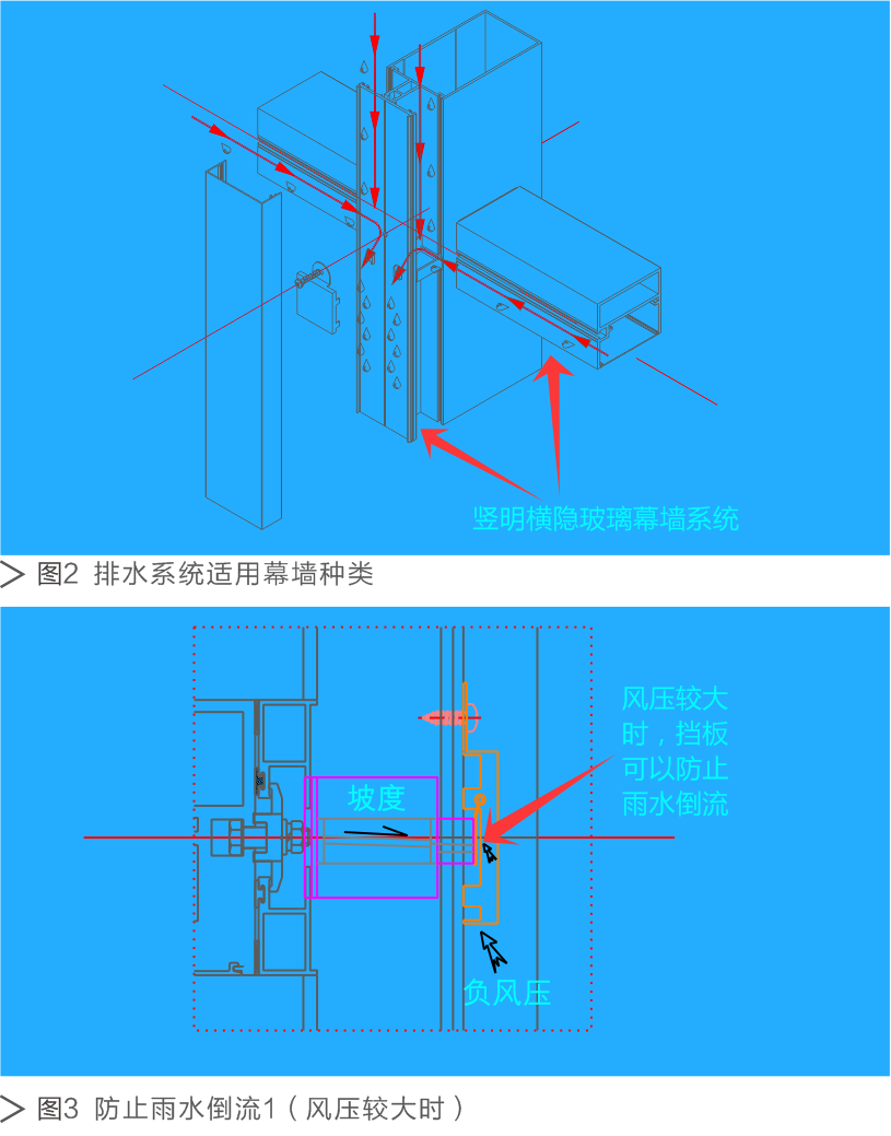 疏导防水允许水进入幕墙横梁、立柱之中,通过设计的幕墙节点结构将水合理排出。