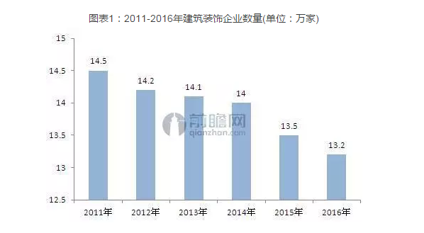 前瞻产业研究院发布的《2017-2022年中国建筑装饰行业发展前景与投资战略规划分析报告》数据显示,2016年我国建筑装饰企业数量继续减少,行业内企业总数在13.2万家左右,比2014年减少了约0.3万家。退出市场的企业主要是三、四线城市中没有资质,主要承接住宅散户装修装饰的微小型企业,有资质的企业退出市场的极少。