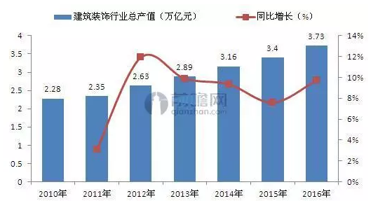 随着政府投资力度的加大和广大居民生活水平的提高,建筑装饰行业迎来了快速发展期,就近年来的产值增速走势来说,住宅装饰装修行业受到宏观环境和政府政策的影响较为明显。根据中国建筑装饰协会的数据显示,2016年全国建筑装饰行业完成工程总产值3.73万亿元,比2015年增加了3400亿元,增长幅度为9.7%。