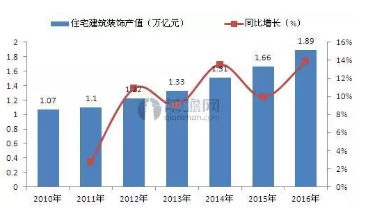 2016年,我国住宅建筑装饰完成产值1.89万亿元,较上年度同比增长13.8%。其中,精装修受国家产业化政策引导和市场认知程度提高等因素的影响,全年完成工程产值6900亿元。而随着存量房数量的增长、二手房交易量的提升和消费升级的推动,二次装修需求增速逐步开始进入释放期,二次装修将逐渐成为住房消费的重要部分。