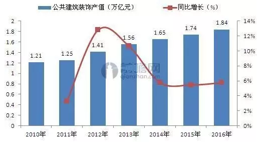 2010-2016年中国公共建筑装饰产值及同比增长(单位:万亿元,%)