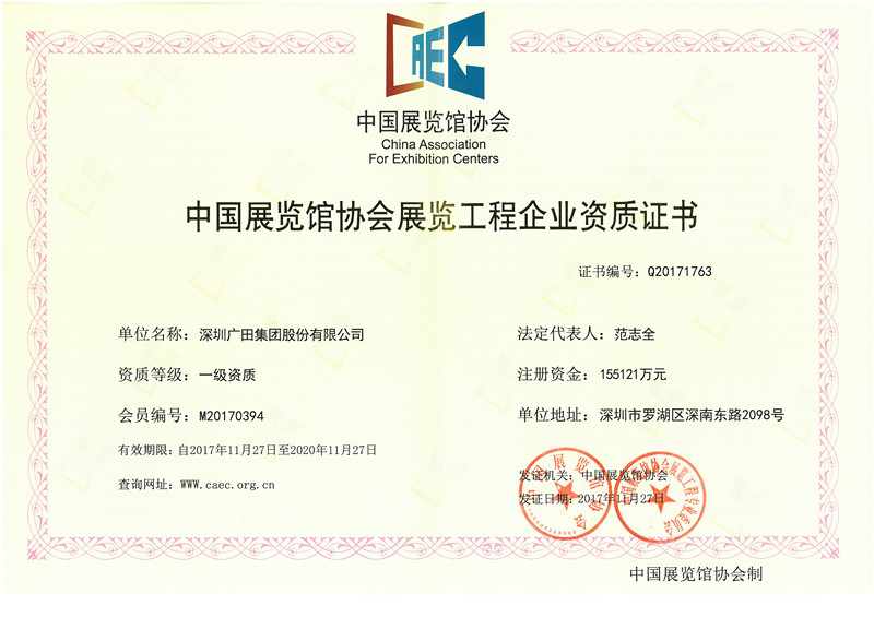 根据《中国展览馆协会展览陈列工程设计与施工一体化资质标准》、《中国展览馆协会展览陈列工程设计与施工一体化资质等级评审与管理办法》的相关规定,中国展览馆协会对广田集团的基本情况、人员条件、技术装备及技术水平等多方面进行了严格审核,最终决定授予广田集团“展览工程一级资质企业”“展览陈列工程设计与施工一体化一级资质”两项一级资质,充分表明中国展协对广田集团的认可与肯定,同时也证明广田集团具备从事展览展示工程设计与施工的技术和服务。