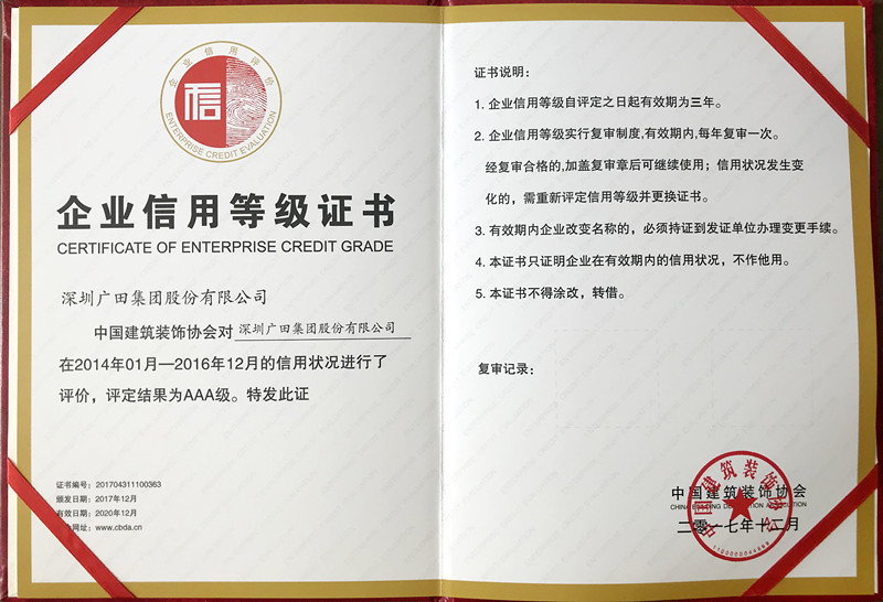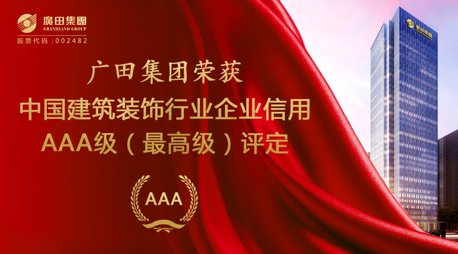 近日,中国建筑装饰行业企业信用等级评价结果公示,广田集团多年来坚持诚信经营、良好履约,获评AAA级信用评价。