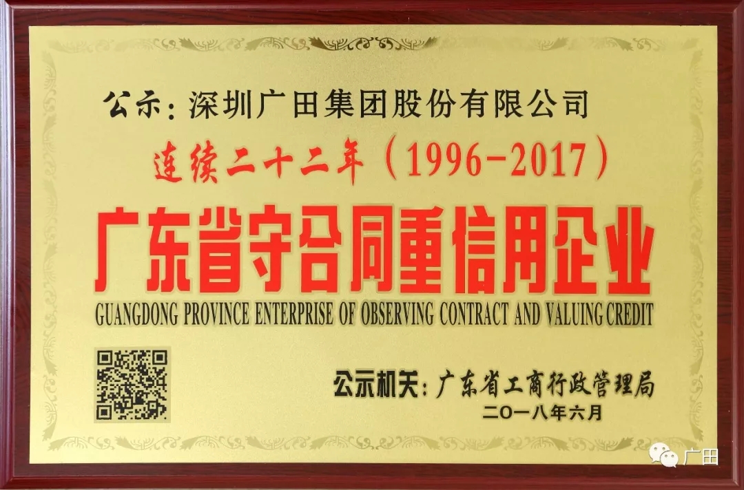 近日,广田集团凭借良好的社会信誉和健全的合同管理体系,连续二十二年荣膺“广东省守合同重信用企业”称号。