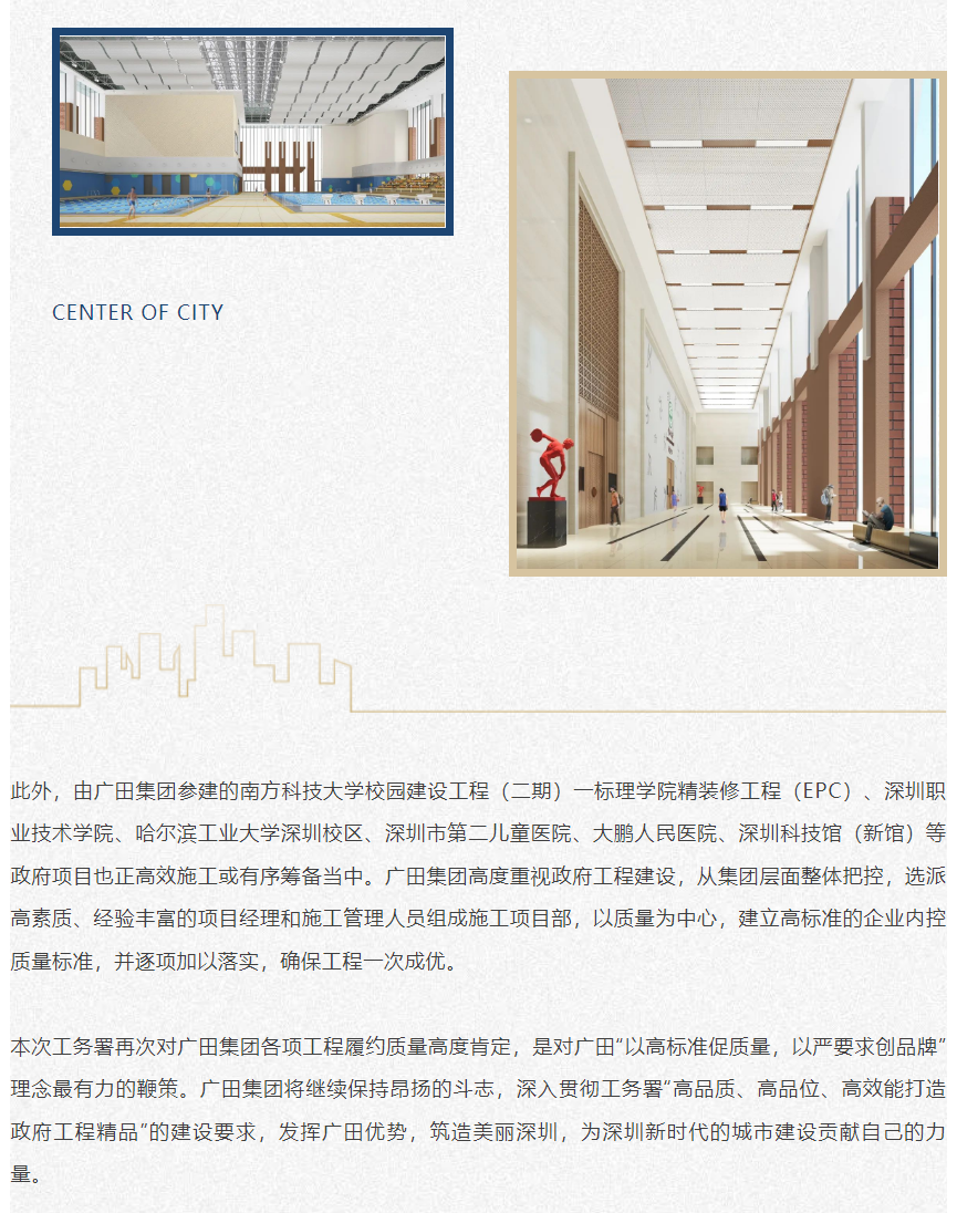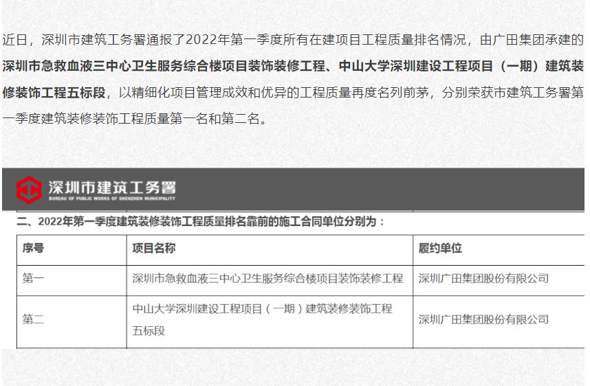 广田集团包揽深圳市工务署第一季度装饰工程质量排名前两名