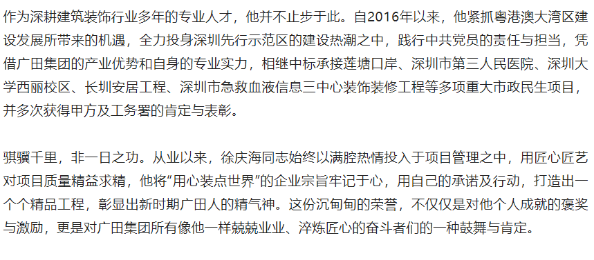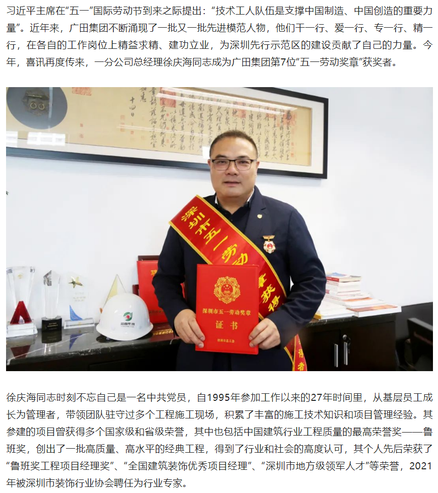 喜讯丨兢兢业业 淬炼匠心——广田集团一分公司总经理徐庆海同志荣获“深圳市五一劳动奖章”
