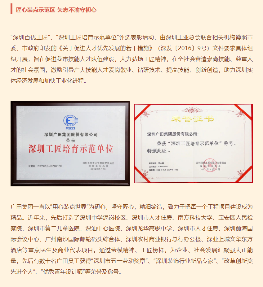 广田集团获得“深圳工匠培育示范单位”、 “深圳企业创新纪录”等多项荣誉