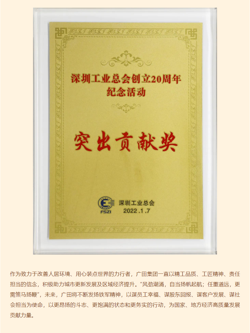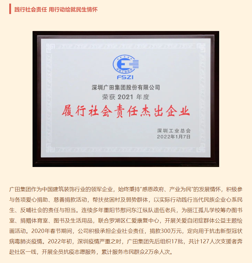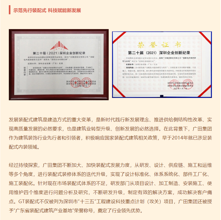 深圳广田集团股份有限公司,简称“广田集团”(股票代码:002482),是特区建工集团旗下一家大型综合性上市公司。公司成立于1995年,是一家具备建筑装饰装修、幕墙、智能化、机电安装、消防等专业工程设计施工一体化能力的国际绿色建造综合集成服务商,拥有建筑装修装饰工程专业承包壹级等十余项壹级、甲级资质,业态涵盖住宅、写字楼、大型公建(大型场馆、学校医院、轨道交通等)、星级酒店、商业综合体及文旅等,连续多年位列中国建筑装饰百强企业第二,是“深圳市知名品牌”、“广东省著名商标”、“中国驰名商标”。