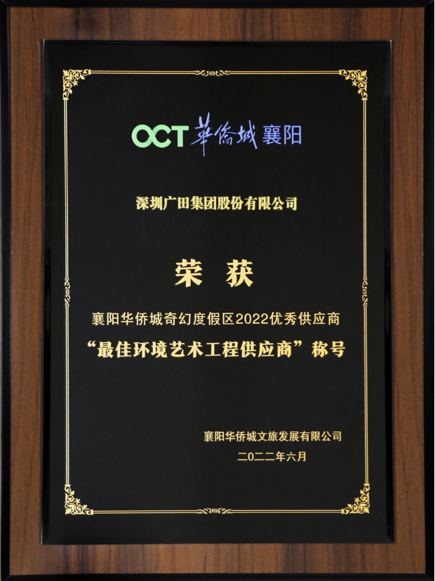2022年6月29日,由广田集团六分公司承建的襄阳华侨城科技园项目获得业主颁发的“最佳环境艺术工程供应商”荣誉称号,此荣誉是对我司高质量项目管理水平及高标准施工管理要求的肯定,也是对广田品牌的充分认可。
