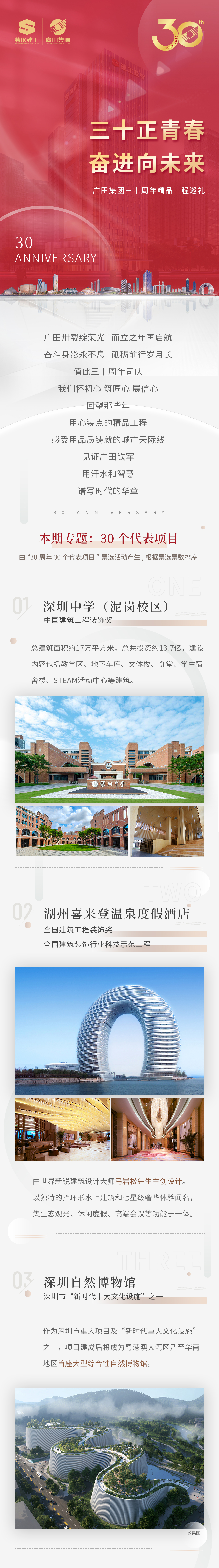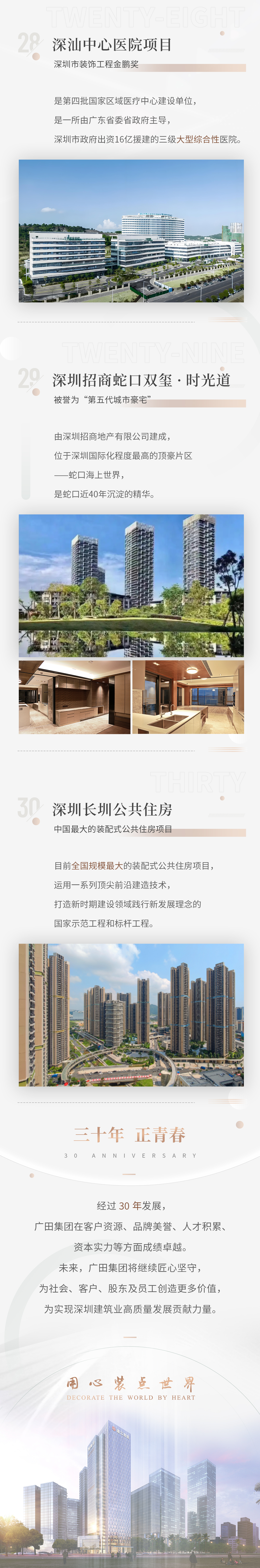 深圳广田集团股份有限公司,简称“广田集团”(股票代码:002482),是特区建工集团旗下一家大型综合性上市公司。公司成立于1995年,是一家具备建筑装饰装修、幕墙、智能化、机电安装、消防等专业工程设计施工一体化能力的国际绿色建造综合集成服务商,拥有建筑装修装饰工程专业承包壹级等十余项壹级、甲级资质,业态涵盖住宅、写字楼、大型公建(大型场馆、学校医院、轨道交通等)、星级酒店、商业综合体及文旅等,连续多年位列中国建筑装饰百强企业第二,是“深圳市知名品牌”、“广东省著名商标”、“中国驰名商标”。