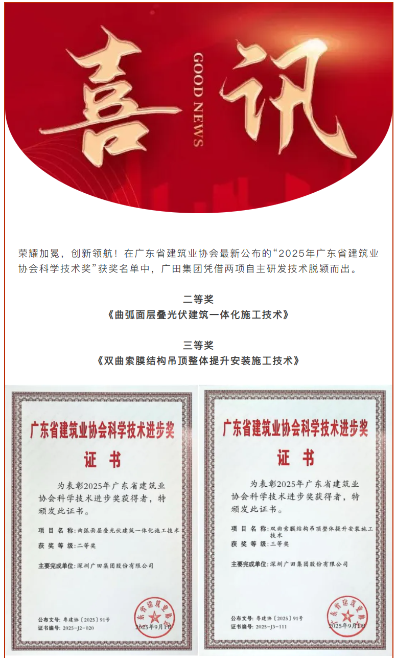 喜讯!广田集团 2 项成果荣获广东省建筑业协会科学技术进步奖