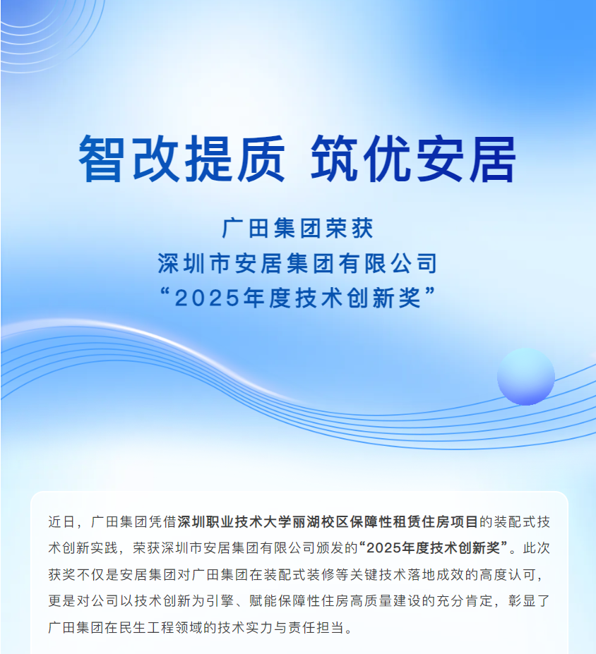 深圳广田集团股份有限公司,简称“广田集团”(股票代码:002482),是特区建工集团旗下一家大型综合性上市公司。公司成立于1995年,是一家具备建筑装饰装修、幕墙、智能化、机电安装、消防等专业工程设计施工一体化能力的国际绿色建造综合集成服务商,拥有建筑装修装饰工程专业承包壹级等十余项壹级、甲级资质,业态涵盖住宅、写字楼、大型公建(大型场馆、学校医院、轨道交通等)、星级酒店、商业综合体及文旅等,连续多年位列中国建筑装饰百强企业第二,是“深圳市知名品牌”、“广东省著名商标”、“中国驰名商标”。